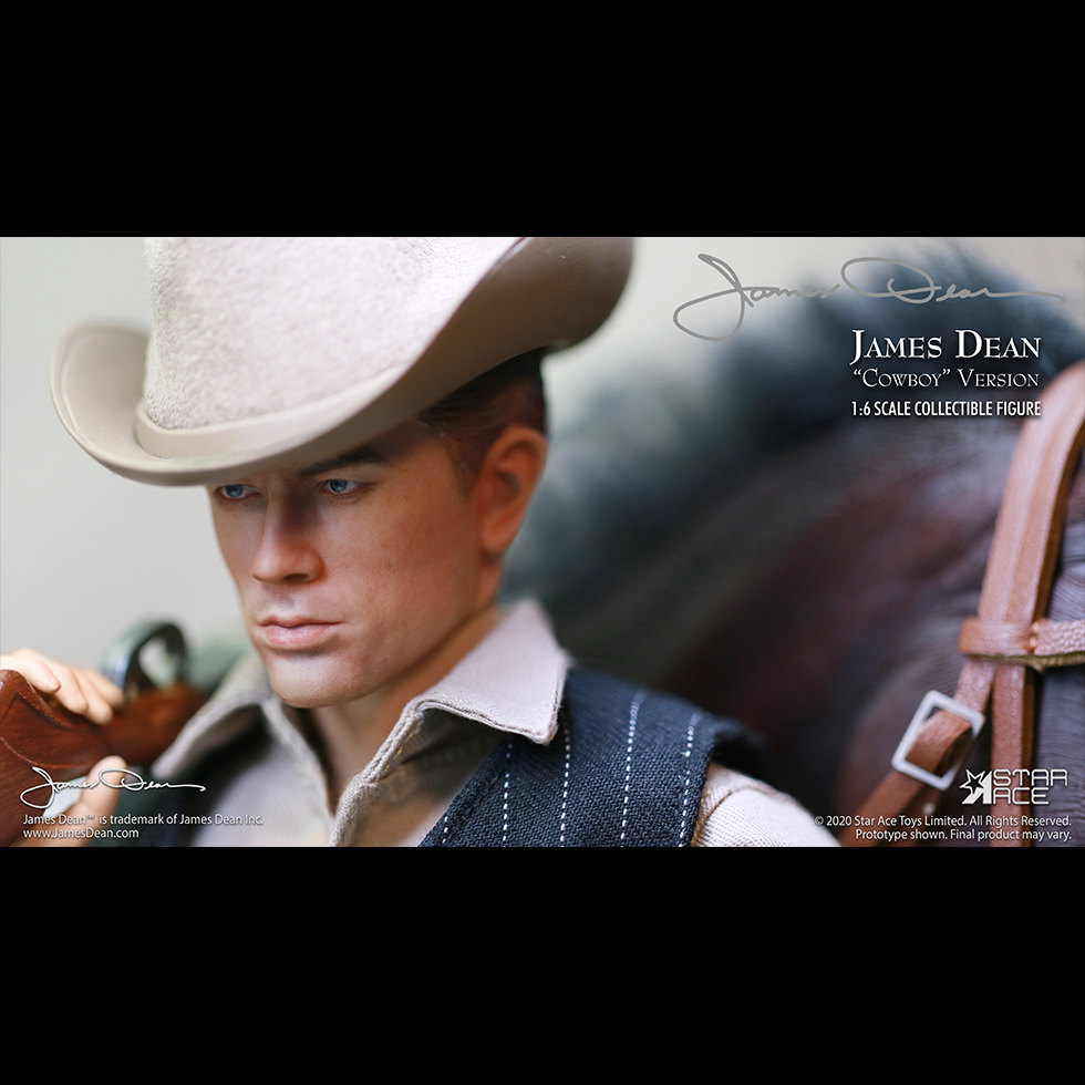 Star Ace brings James Dean to life as a fully realized sixth scale figure dress as a “Cowboy,” featuring a detailed and accurate likeness and dressed in a cowboy outfit of shirt, vest, jeans, cowboy boots and cowboy hat. Accessories include glasses, a rifle and a lariat.